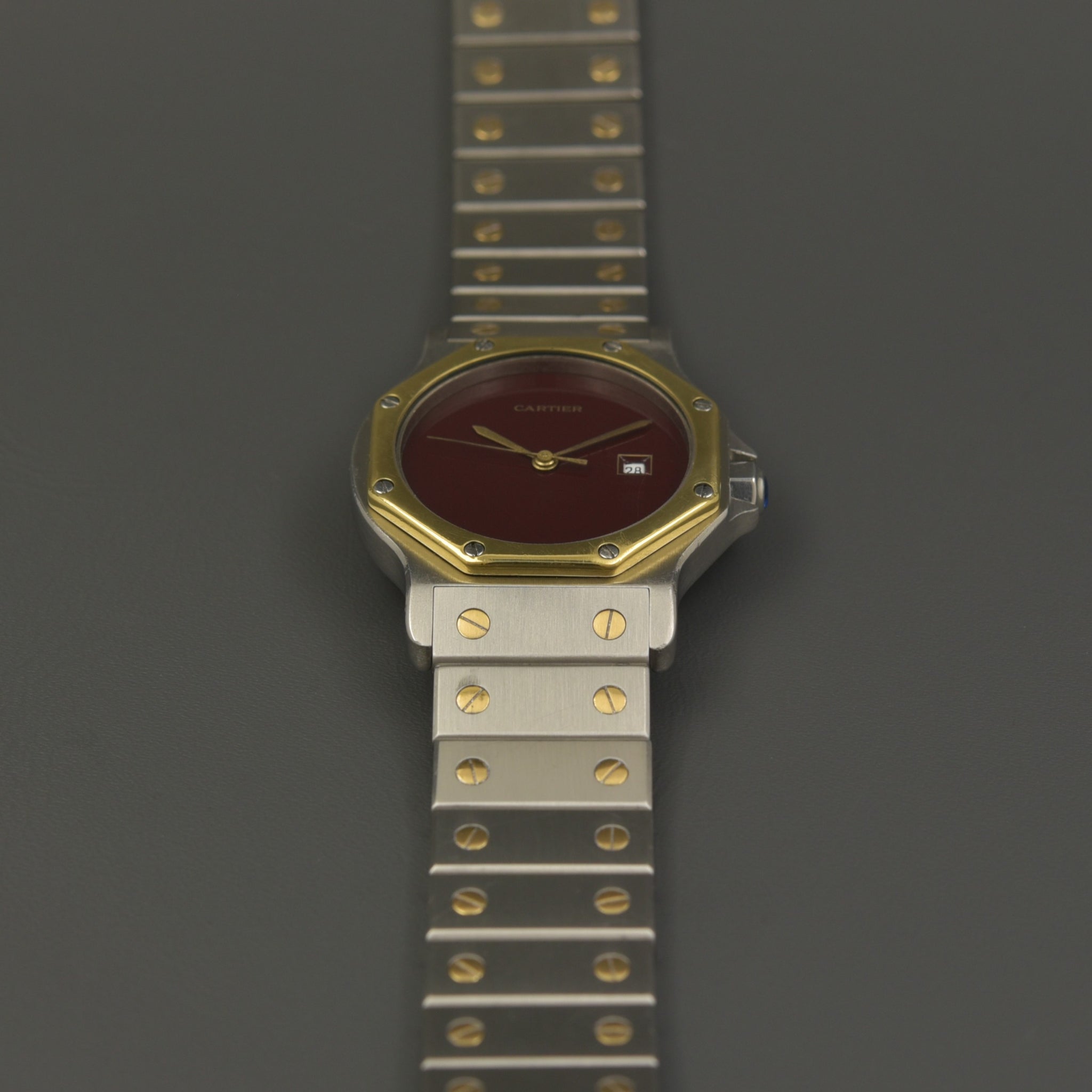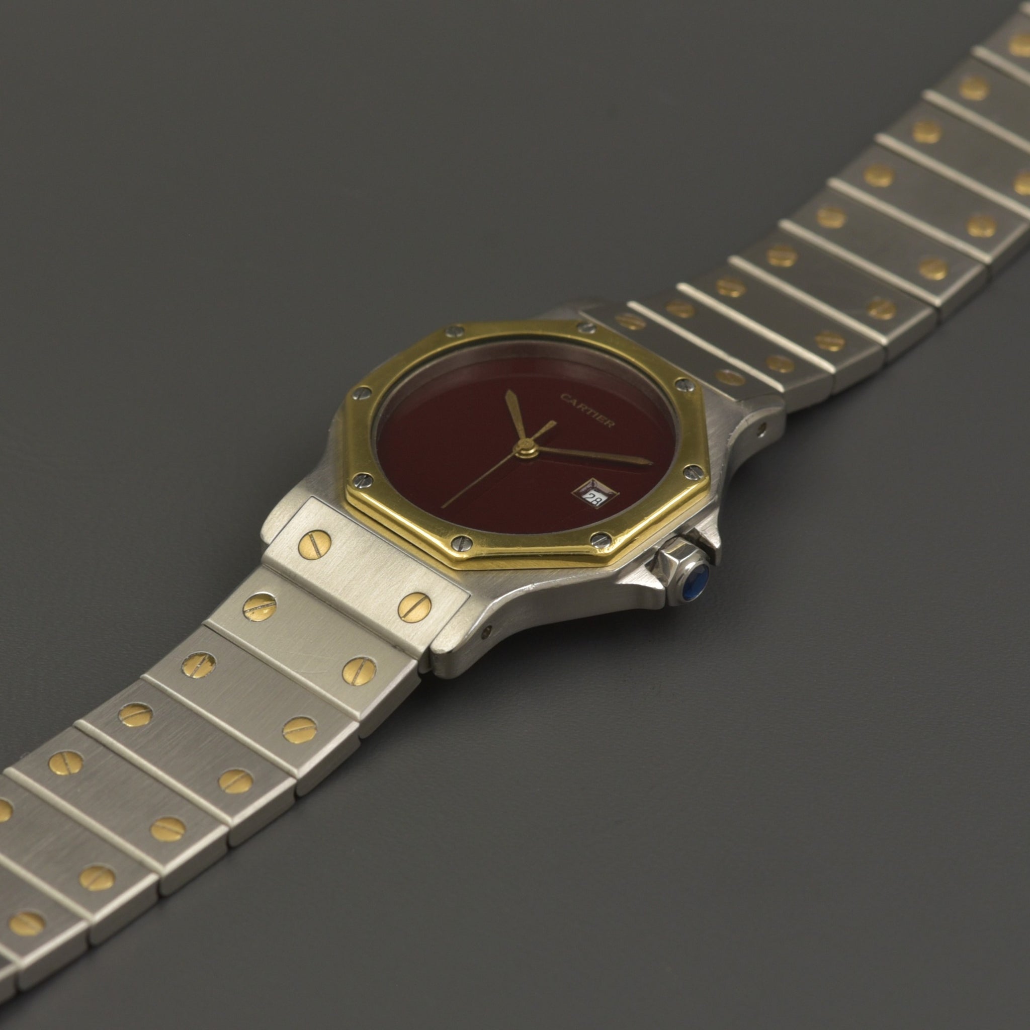 The automatic movement is running perfectly and got fully serviced in 2025. A rare and special feature is the beautiful, burgundy red dial. The watch has a blue sapphire crown.